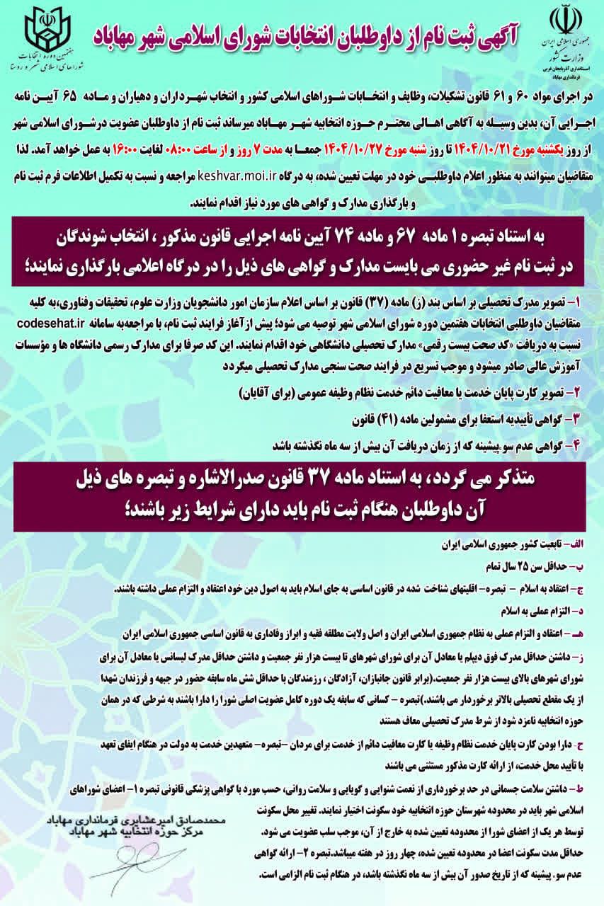 آگهی ثبت نام از داوطلبان انتخابات شوراى اسلامى شهر مهاباد