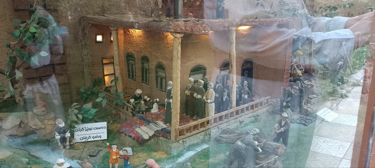 گوتی لێتان وەرناگرین. چەند پلیکان چوینە خوارێ لە زەویەکی سێ کوچکە لایەکی پەیکەرە و هونەرەکانی لە دیوی چکۆلە و شوشەبەند دانابوون. ئەولای دیکە بە پەیکەرەی گەورە لەم زەویە کەمەدا. نێوانەکەشی سەیرانگەلی نشیمەن بوو کە جێی سێ چوار بنەماڵان دەبوو. بە چراخانە دەکرا شەوانەش کەڵک لەم پێشانگایە وەرگیرێ. گوتی: مڵکی خۆمە. کاک عوسمان دەماو دەم لەگەڵمان دەهات و بابەتەکانی بۆ شی دەکردینەوە باوەڕکە بەم دەست ڕەنگینیەی مڕۆڤی دەبردەوە ساڵانی گەلێ ڕابردوو. زیاتر لە هەزار و شەش سەد پەیکەرەی لێ بوون، لە ژیانی منداڵ تا کۆتای تەمەنی، ژیانی لا دێی، سەردەمی ئەرباب و ڕعیەتی، لەسەربان سواغ کردن و نایەکێشان و باگوردان. لە جوتیاری دێمەو و بەراو. نازانم کام بەشی باس لێ بکەم، چاووم بە مزگەووت کەووت؛ کاک عوسمان فەرمووی: ئەمە مزگەوتی حەمامیانە، ئەمەش پەیکەری زانای ناوداری کورد کە لەوێ مەلا بوو بە حاڵم وەبیرم دێ، مامۆستا مەلا عەلی حەمامیانە، دەوراندەوری مامۆستا؛ فەقێی کتێب بەدەستی لەسەر چووک دانیشتوو دانرابوو. هەر دەدگووت ڕاستیە. هەر هەستم دەکرد ئەمە سەردەمی خۆمە کە فەقێ بووم واها چوومە ناو ئەم عالەمەی فێنکایم بە دڵی دا دەهات و هەندێ جار هەناسەی قووڵ. فەقێکانی ئەمڕۆکەی مزگەوتی قوبای سنەم هاتەوە بیر کە ئەمڕۆکە تاجی زێڕینی مەلایەتیان خرا سەریان. ئاخ خۆزیە ئێمەش لەم کۆڕە بەشکۆیە بەشدار باین، ئەما داری بریا بۆ کەسی بەر نەهێناوە. دەورێکم بە مێشکم لێدا؛ بۆکان! کوا مامۆستا مەلا هادی سەرات، کوا حاجی بابە شێخی تورجانت، کوا مەلا ساڵحی ئەختەتەت، کوا مامۆستا مەلا شێخ حەسەنی شێخلەرت، کوا حاجی مامۆستا مەلا جەسیمی سەعادەتی، کۆا حاجی ڕەحماناغات، کوا عەللامە عەبدولحەمید عەبقەریت، کوا مامۆستا مەلا حیسامەدین شفیعیت، کوا هەزار کوای دیکەم بە زەینی دا هات، داخەکەم! ئەم فێرگانە یا ڕوخێنراوون و یا بە قوفڵ و ئاچەر داخراوون.