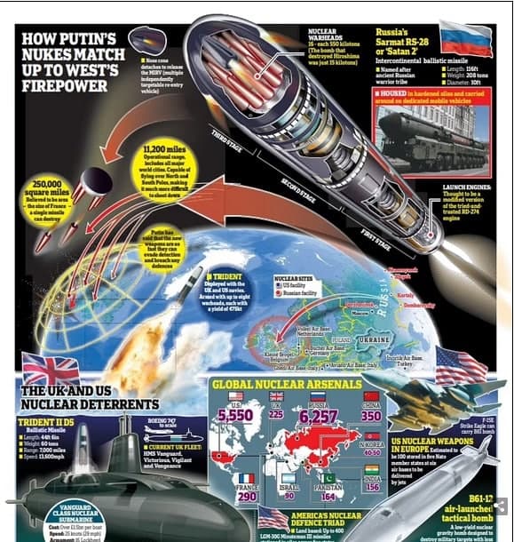 کلاهک هستهای کلاهکی حاوی مواد منفجره یا سمی است که توسط موشک یا اژدر شلیک میشوند که و قابلیت شکافت یا همجوشی را دارد. این تسلیحات هنوز در طول منازعات مورد استفاده قرار نگرفته اند و تا زمان فعلی تنها زمان استفاده از تسلیحات هستهای در نبردها در جریان حمله ایالات متحده به ژاپن در آگوست سال ۱۹۴۵ میلادی در پایان جنگ جهانی دوم بود. " توبیاس الوود" رئیس کمیته دفاعی در مجلس عوام بریتانیا میگوید که در "بدترین سناریو" آن است که پوتین میتواند تسلیحات هستهای تاکتیکی کم بازده را در صورتی که نیروهایش نتوانند در اوکراین پیشرفت کنند مورد استفاده قرار دهد. به گفته الوود، متحدان غربی باید اکنون فکر کنند که اگر روسها از نیروهای غیر متعارف استفاده کند چه پاسخی خواهند داشت.