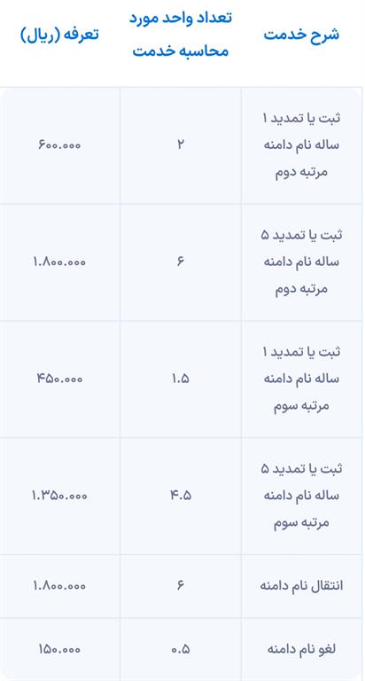 بر اساس این مصوبه، تعرفه ارایه خدمات ثبت، تمدید، انتقال یا لغو نام دامنههای کشوری به شرح جدول و بر اساس تعداد واحد خدمت محاسبه و تعرفه هر واحد خدمت 300,000 ریال تعیین شد.