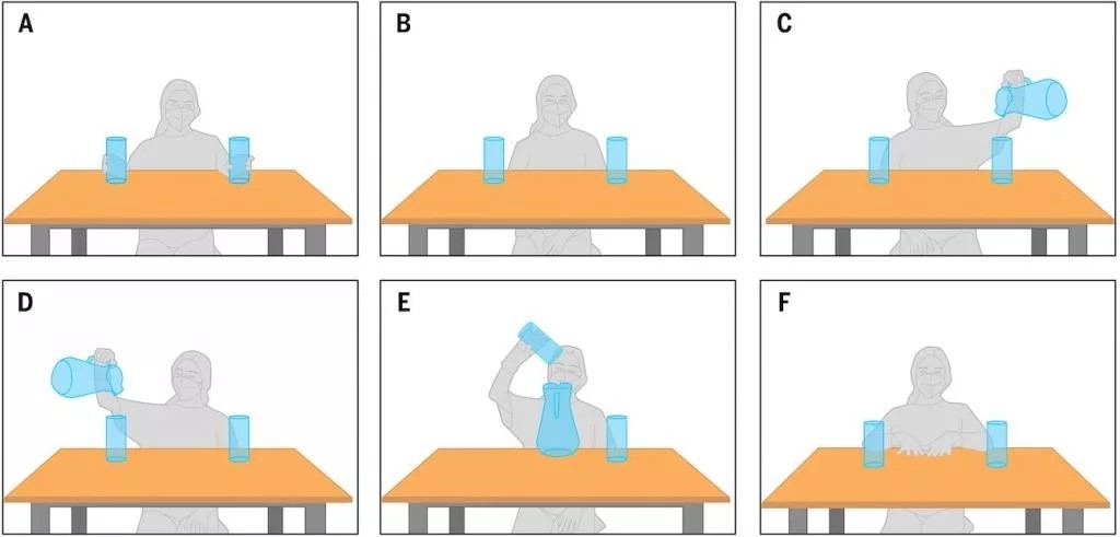 در یک سری آزمایشهای کنترلشده، پژوهشگران دانشگاه جانز هاپکینز با یک بونوبوی ۴۳ ساله به نام «کانزی» (Kanzi) وارد تعامل شدند. در یکی از آزمایشها، محققی روبهروی کانزی نشست و وانمود کرد که از یک پارچ خالی، آبمیوه درون دو فنجان خالی میریزد. سپس وانمود کرد که آبمیوه یکی از فنجانها را دور میریزد و با اشاره از کانزی پرسید: «آبمیوه در کدام لیوان است؟»
